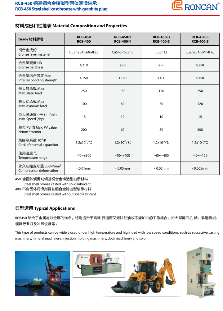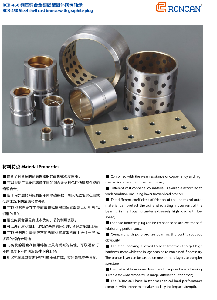 RCB450結(jié)合了金屬與非金屬的優(yōu)點(diǎn),特別適合于高載低速而又無法加油或不能加油的工作場合,如大型港口機(jī)械、軋鋼機(jī)械、模具行業(yè)以及沖壓設(shè)備等。